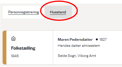 Stammer personregistreringen fra en kilde, hvor flere personer er omtalt sammen, kan du se de relaterede personregistreringer i en fane for sig. Andre personer i samme husstand, registreret i samme folketælling kan ses under fanen husstand. For øvrige kilder hedder fanen ‘Relaterede personer’ og viser de andre personer, der er en del af samme hændelse, fx forældre til et født barn. Den personregistrering, du er inde på, vil være fremhævet i listen, og rækkefølgen vil være sådan, som personerne stod opført i kilden.
