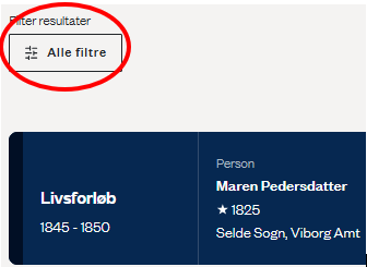 Du kan filtrere dit søgeresultat på nogle af de samme parametre, som du kan søge på, samt på kildetype. Ønsker du fx kun at se livsforløb, hvori der indgår folketællinger, kan du vælge det. Vælger du flere filtre, fungerer det således, at