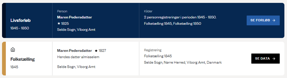 Et livsforløb består af en række personregistreringer, som er linket sammen to og to. Det navn, fødeår og fødested, der står i søgeresultatet samt øverst på siden med hele livsforløbet, er trukket fra den seneste personregistrering i livsforløbet, som indeholder sådanne oplysninger.